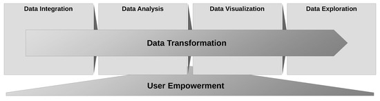 Addressing the growing importance of visual Big Data analysis and the immense opportunities of AI and ML, some authors of this paper introduced a reference model for Information Systems (IS) [11]. It standardizes terminology, information artifacts, and user stereotypes for AI and ML applications within the IVIS4BigData data analysis pipeline, originally introduced by Bornschlegl in 2016 [11]. This analysis pipeline contains four data transformation processing steps: data integration, data analysis, data visualization, and data exploration [11]. AI and ML can be applied for every processing step [11]. AI2VIS4BigData extends IVIS4BigData with AI and ML-based user empowerment for non-technical user stereotypes that could benefit from Big Data insights within these four processing steps [5]. Figure 2 displays these two orthogonally arranged principles of AI and ML (user empowerment and data transformation) to be applied during visual Big Data analysis.