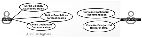 Analyzing target users and their requirements is the starting point of every concept design for user-empowering applications relevant to the AI2VIS4BigData reference model [11]. Norman and Draper’s User-Centered Design (UCD) methodology [14] is applied for exactly this purpose. It divides system design into four phases [14]: context definition, requirements analysis, concept design, and evaluation [14]. This section follows the UCD approach, details use context, specifies requirements in use cases, and creates relevant conceptual models. It will also address the identified remaining challenges from Section 2: