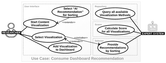 The use case in Figure 5 contains four different system boundaries: a user interface used by the end user (researcher), a repository component that contains all available recommendations, a scorer component that scores the information content of visualization methods for certain data, and a selector component that uses these scores to provide recommendations to the end user. Table 1 displays a tabular description of this exemplary use case, enabling derivation of requirements. This exemplary use case serves as a basis for deriving a conceptual architecture within the remainder of this section.