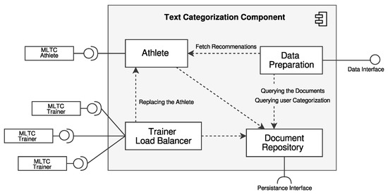 The Text Categorization component consists of a backend and a frontend application. The backend application connects to Eljasik-Swobodas’s MLTC component [9] for providing AI and ML-based category recommendations. Therefore, it implements the concept of trainer and athlete components. A trainer load balancer component connects to several MLTC microservice-based trainers selects the most suitable ML model from these trainers, and forwards it to an athlete component for replacement. The athlete executes this model via an MLTC athlete (also microservice-based) on documents from a document repository and provides generated category recommendations to a data preparation component upon request. The data preparation component collects the recommendations and documents from the document repository and provides them to the user interface. The internal conceptual architecture of this component is shown in Figure 6. When using the MLTC trainer proposed by Eljasik-Swoboda [9], the system cannot generate new categories [9]. This disadvantage is considered because this is not a requirement of qualitative content analysis.