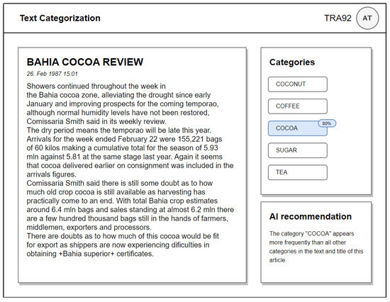 The frontend application is structured in a title bar and text categorization-specific content. The title bar displays the name of the current component and the currently logged-in users across all components. The text categorization-specific content is structured into a display of the textual document and a category and AI recommendation pane. The resulting UI and UX concept is displayed in Figure 7.