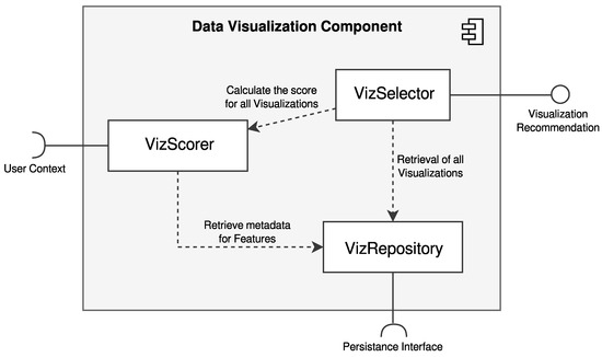 The Data Visualization component is also structured into a backend and a frontend application. The backend application is visualized in Figure 8. It consists of three components: a visualization repository, a selector, and a scorer. The repository queries available visualizations from persistency and provides them to the two other components. The selector component is triggered from another component with data that should be visualized. It uses the visualizations from the repository and triggers the visualization scoring component. The scorer component accesses metadata on the repository’s visualizations and context information on the user and its system to determine a score for given data.