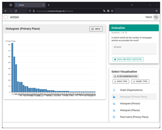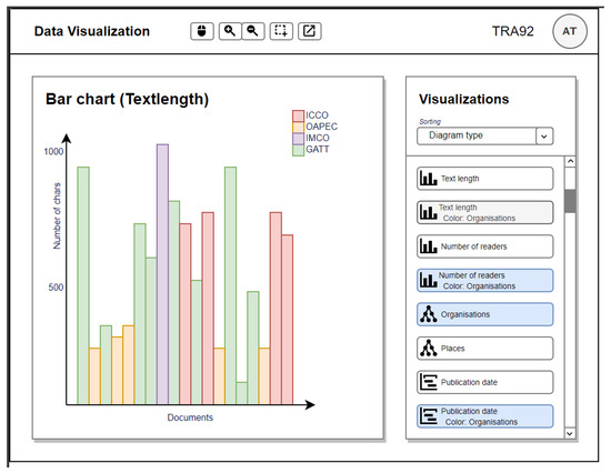 The UI/UX concept of the Data Visualization component aligns with the presented Text Categorization component to maximize user comprehensibility. It is similarly structured with a content area on the left and an interaction area on the right, as shown in Figure 16. In the upper right column, the evaluating user encounters questions to be answered using the provided visualizations. Below this section, the user can choose visualizations. AI-recommended visualizations are accentuated with a blue hue to maintain consistency with the prototype’s color scheme.
