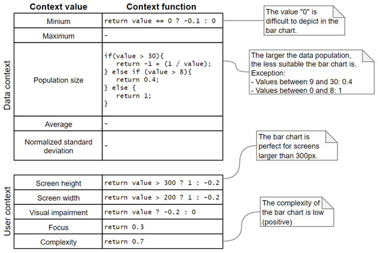 Figure 10 displays exemplary rules of the expert system for bar charts that determine recommendations for suitable visualizations. These recommendations are created based on data context (e.g., is the input data for visualization suitable for certain visualizations) and user context (e.g., screen height). Similar rules are defined for every available visualization type in the information system. These rules calculate a “fitness score” for each visualization type by accumulating the results for all data and user context values. The rules have been determined by reusing existing heuristics or measuring user behavior in a prototype implementation. This approach is limited by the ability of a human expert to balance the different context functions with the different visualization types. We found a good balance with six visualization types and seven context functions.