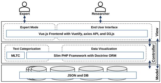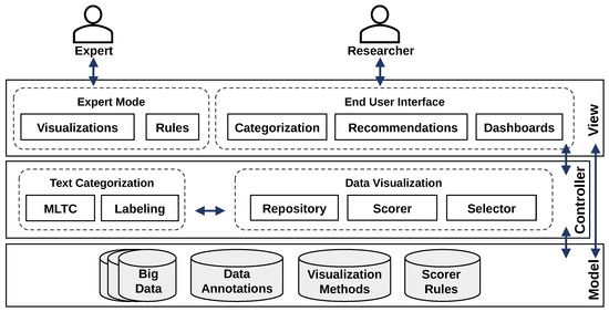 The conceptual architecture of the information system is shown in Figure 11. It shows two different views within the view layer of the architecture: an expert mode to add new visualizations and rules to the system and an end user interface with the frontend components for text categorization and data visualization. The controller contains the components introduced in the previous sub-sections. The model layer contains the symbolic data (Big Data), annotations (categories), visualization methods, and rules for the expert system.