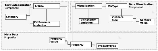 The system’s data model is shown in Figure 12. It contains 11 entities across three components: text categorization, data visualization, and a connecting metadata component. It displays that each article can be assigned to one category (direct relationship) and associated with a category via a category recommendation (indirect relationship). For visualizations, the same pattern is repeated and extended on visualization score rules and their content value (refer to Figure 10). The metadata connects articles and visualizations.