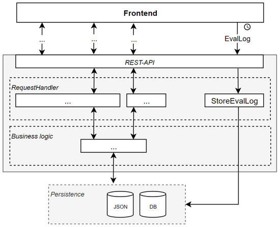A notable feature of the communication architecture in Figure 14 is the EvalLog, designed to track and log every user interaction with the frontend. This capability allows for the reproduction of user behavior. The recorded data is transmitted and stored in the backend through the REST API, ultimately stored in the database. This logging mechanism plays a pivotal role in generating metrics for evaluation purposes.