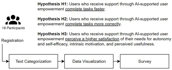 Figure 17 summarizes the quantitative evaluation. Three research hypotheses guide the design of the evaluation. The 18 participants initiated the evaluation by registering and then proceeding through the various stages following the evaluation.