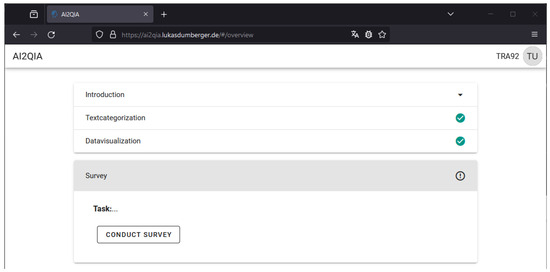The quantitative evaluation involved 18 participants, all familiar with digital media. Participants were given a link to the application, where they completed the registration process. The overview page is displayed in Figure 18. It served as the starting point for evaluating the Text Categorization and Data Visualization components and the final survey.