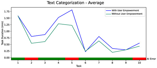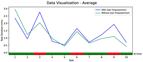The hypothesis states that AI-supported users might complete tasks more quickly than those without support. Figure 19 illustrates the average time (y-axis) the two evaluation groups needed to complete the ten tasks (x-axis). The tasks marked in red included the simulated AI failure; the ones in green relate to correct AI predictions.