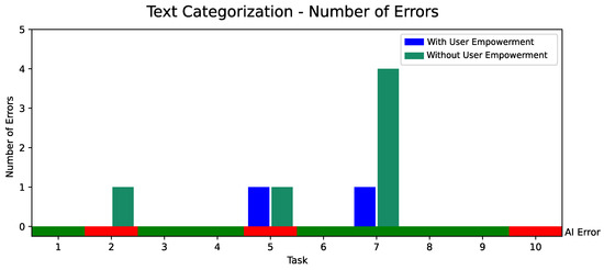 If this hypothesis holds, AI-supported users may provide more accurate answers than those without support. This hypothesis is indeed confirmed in the case of the Text Categorization component. Figure 21 illustrates, on the y-axis, the number of errors each group encountered during task processing.