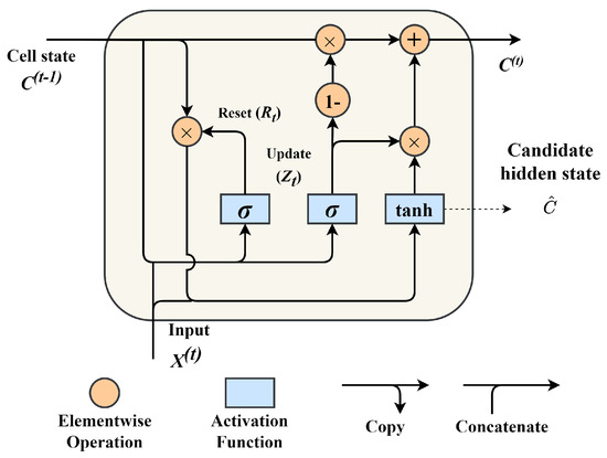 GRU is a modified version of Recurrent Neural Network (RNN). GRU has two gates: an update gate and a reset gate. There are no memory cells inside. Less operating time is required compared to other variants of RNN, such as LSTM, since the gating mechanism in GRU is more straightforward than in LSTM. The update gate establishes the proportion of prior state data that must be sent to the following step. Using this feature reduces the fundamental RNN’s vanishing gradient problem. The operations of a GRU cell are depicted by Equations (1)–(4) and a diagram of a GRU cell is shown in Figure 1. Table 2 provides a brief overview of each paramter presented in the equations. We derived the figure and equations from the study in [35].