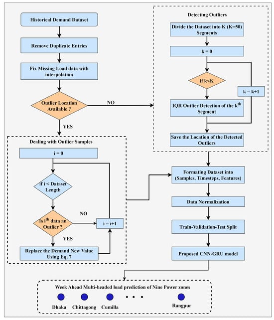 The workflow of this study is depicted in Figure 3. After collecting the historical demand dataset, we eliminated duplicate values and addressed any missing demands. Subsequently, an outlier detection technique was applied to detect outlier indices. Upon identifying outlier samples, we corrected them using a straightforward averaging technique. Finally, the dataset underwent normalization and was partitioned into training, testing, and validation sets before being fed into the forecasting models to predict load demand across multiple regions. The approach taken in this research can be seen as the combination of the following key steps.