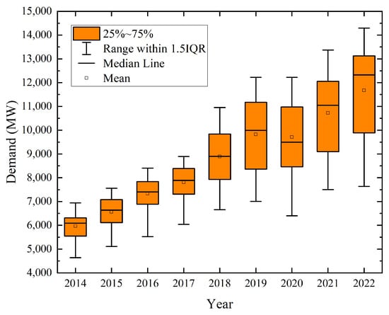 Figure 5. Box plot of the total load demand from 2014 to 2022. - Outlier Detection: The initially collected dataset includes a considerable amount of outlier observations. Due to the non-stationary characteristics present in our dataset, it is challenging to adopt traditional outlier detection mechanisms. Hence, we have implemented a simple yet efficient mechanism to detect problematic measurements effectively. We have divided our dataset into K subsections for this technique. Then, we calculated the interquartile range in each subsection. A sample is considered an outlier if the value is less than and greater than . Many studies consider removing the outlier values. However, we uniquely fix the outliers in this research. Since the electrical demand dataset also has weekly seasonality, we consider the average of 4 days, which is the value of two weeks in the past and future, instead of the previous outlier value as shown in Equation (7). Here, represents the electricity demand of ith index for any segment. The pseudocode for the outlier detection is presented in Algorithm 1. For simplicity of illustration, we focused on two cities, Cumilla and Khulna, in Figure 6. These figures illustrate the demand of these two regions before and after handling outlier measurements. Evidently, the proposed technique in this study can successfully identify and fix the outliers.