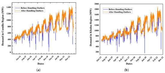 Figure 6. Handling outlier measurements with IQR and load averaging. (a) Before and after handling outliers of load demand in Cumilla region. (b) Before and after handling outliers of load demand in Khulna region.