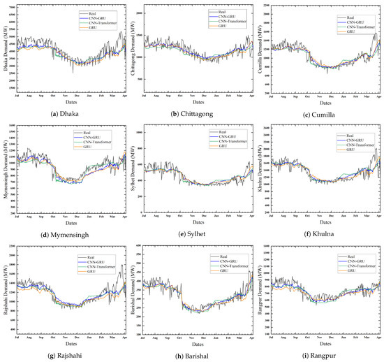Load demand prediction for nine regions from July 2022 to April 2023 using GRU, CNN-Transformer, and the proposed CNN-GRU method.