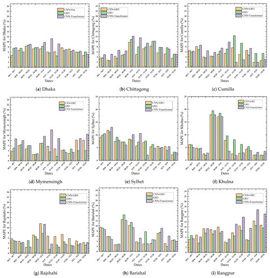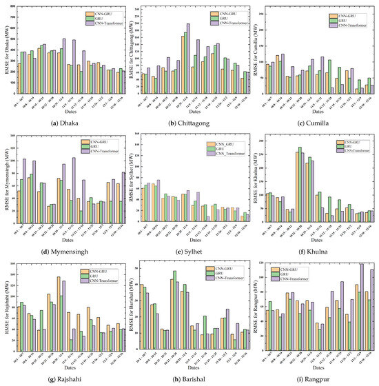 The real-world power system is massive and very complex. The power system’s highly non-linear properties and randomness introduce prediction challenges. This can be observed in the figures where the actual data consist of sudden variations. To keep the illustrations clear and concise, we showcase the prediction outcomes of only the three top-scoring models: CNN-GRU, GRU, and CNN-Transformer. The figures verify that the CNN-GRU model can follow the demand trend more closely than other models. Table 4 compares the MAPE of several models over a seven-day forecasting period in nine distinct zones for the time period between July and December 2022. The RMSE error obtained from different models for the same time period is listed in Table 5. The MAPE scores of the naive predictor for nine different zones are 0.0539, 0.0641, 0.0845, 0.0729, 0.1227, 0.0689, 0.0583, 0.0977, and 0.0774, respectively, and for the corresponding areas, the RMSE scores are 310.9725, 100.9114, 132.3682, 94.7536, 76.7995, 135.4886, 98.0518, 43.4898, and 74.0442. Evidently, the proposed CNN-GRU model is more effective than the naive baseline as well as other DL approaches, achieving the least MAPE of 0.0544 in the Chittagong Region and the highest score of 0.0905 in Sylhet. Similarly, the lowest and highest RMSE scores of the proposed model are 33.5080 and 378.2723, respectively, for Barishal and Dhaka. In comparison, the second best model, namely GRU, achieved MAPE score ranging from 0.0602 to 0.0931 across all division on test data. The proposed model significantly outperforms GRU in all of the regions. We have investigated the outcome of famous transformer architecture on our task. Among the transformer models, only the CNN-Transformer hybrid approach performed better, obtaining the least RMSE of 33.1362 in Barishal and the highest of 434.7402 in Dhaka. In comparison, the proposed technique performed 15.98% and 25.37% better in these two regions, respectively. Although CNN-Transformer performed better than the proposed method in Barishal Division, both RMSE and MAPE scores are close for both models. The graphical representation in Figure 9 illustrates the forecast results for the nine regions spanning from July 2022 to April 2023. The figures validate the seasonal variations as shown in our prediction curve during the summer, winter, spring, and autumn months. It is worth noting that, in certain regions, as the prediction timeframe extends further from the training period, the models exhibit suboptimal performance. This can be attributed to the limitation of traditional DL models, as these algorithms require complete retraining with new observations. MAPE error rates for all the weeks from July to December 2022 are illustrated in Figure 10 concerning the three best-performing models. Similarly, the RMSE scores for the same observation periods are depicted in Figure 11. Overall, CNN-GRU achieved the lowest MAPE error across the observation periods for all regions.