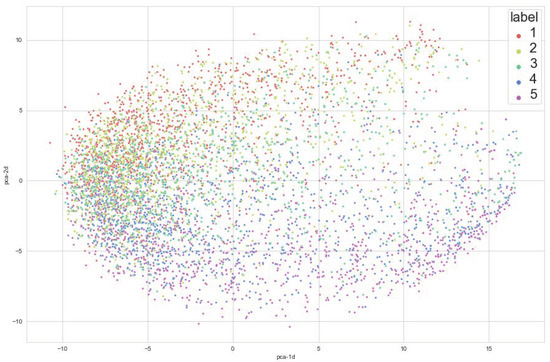 For a quick impression of what the dataset looks like, see Figure 1 and Figure 2 for its 2D visualizations obtained by PCA and TSNE, respectively. In the visualization, the relative location of the data points representing the individual text highlights the difficulty of clustering the vectors produced from the texts.