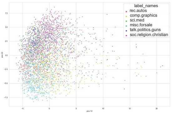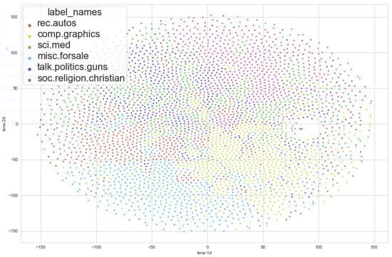 The 20 Newsgroups dataset is a widely used benchmarking dataset that provides training and testing subsets. The dataset contains twenty classes in six categories. Furthermore, different software packages contain this dataset, allowing quick and easy use without pre-processing steps. For an impression of this dataset, see Figure 3 and Figure 4 for its 2D visualizations obtained using PCA and TSNE, respectively.