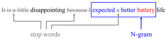 Figure 5. Extracting a keyphrase candidate from a simple review using an N-gram-based approach (). - Select the top N-grams based on their term frequency [34] and inverse document frequency-based [35] (TF-IDF) using a threshold for the TF-IDF score.