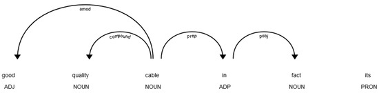 In the case of this method, we break down the reviews into sentences and identify their respective keywords. Then, we look for the context of the keywords, which we achieve by applying dependency analysis. An example of dependency analysis is shown in Figure 6. During this process, we parse the whole sentence to obtain its grammatical structure and identify “head” words and words that are grammatically connected to them. After this, we identify the keyword and its “head” word h; then, we look for words that were connected to h while keeping the original order of the words in the sentence. We look for words connected to h instead of because was usually an adjective, adverb, or some other word that expresses emotions or qualities and has no particular meaning by itself. Therefore, instead of looking for words connected to this term, we focused on the word that is grammatically connected to (e.g., a noun). During the search procedure, we exclude common words, such as prepositional modifiers and words representing coordinating conjunctions. This way, the resulting phrase contained the most important parts (nouns, adjectives, etc.).
