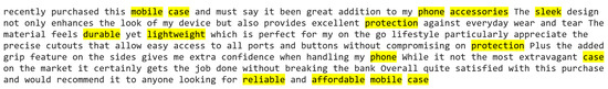 We have created multiple different classification tasks from the Amazon Reviews dataset. Due to its relatively large size compared to the available resources, the Cell Phones and Accessories (CPA) subset was used, similar to the evaluation of the keyword extraction models. From the dataset, we selected products with a uniform set of 100 reviews for each class (ratings from 1 to 5). Thus, we created a classification task with 6000 training and 1500 testing records, which we used for a five-label multi-classification. In addition, from the CPA dataset, we took a random sample of 100 sentences, the details of which are described in Section 5.1.4.