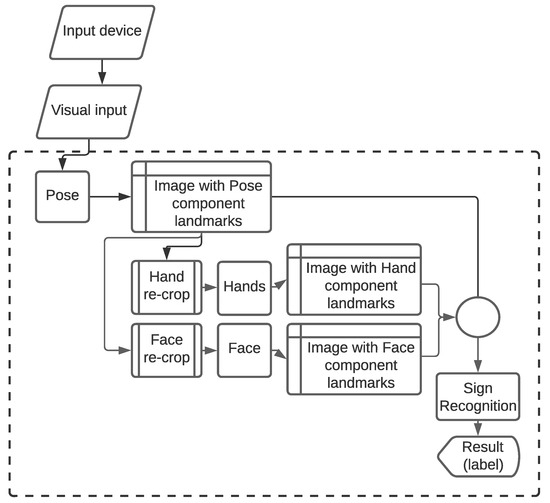 From the above, a parallel can be seen between object detection and action detection. In action detection, RNNs bring the “memory” component, but how it is implemented may vary. When considering just the positional values of the hands of a person making the signs, a fairly good recognition could be achieved. While the hand component is the most important one in this use case, the consideration of other components might be convenient when developing a richer solution. The other components used, namely, pose and face, enhance the translation system through Holism. The pose component is advantageous when there are hands overlapping, since the model determines elements like wrists, then “understands” there are two hands. The face component is valuable because facial expressions are a relevant part of sign language, expressing emotions but also linguistic information.