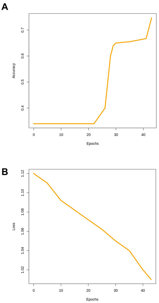 When looking at the performance per epoch, for accuracy per epoch (Figure 6A), one can see that there was a slow increase in value until 20 or so epochs were reached, until the best value was achieved in the reported 46 epochs. For the loss (Figure 6B), it seems to behave appropriately from the beginning, lowering in value until reaching a minimum in the final epoch.
