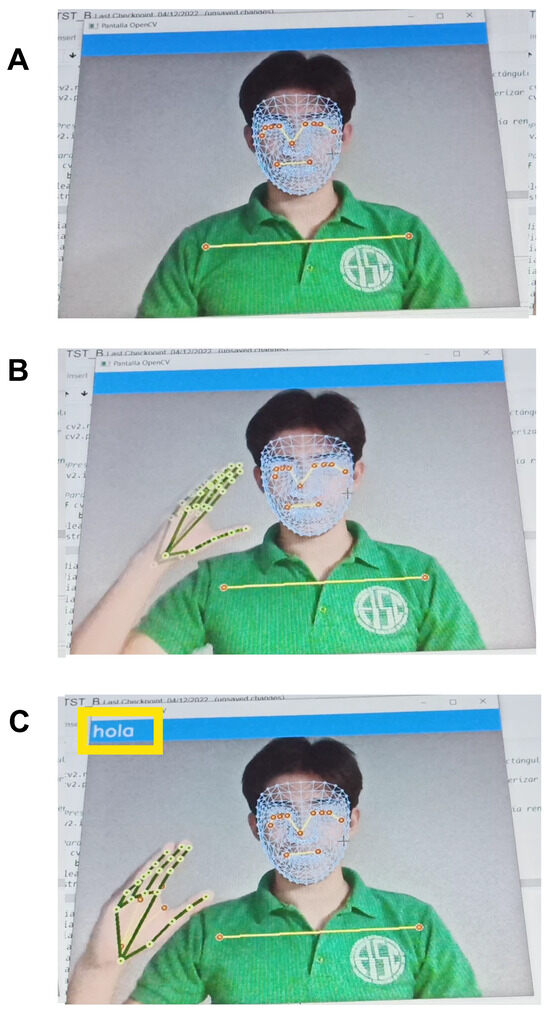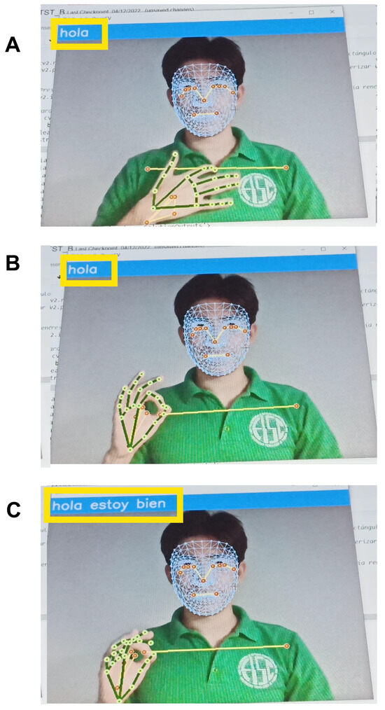 Recognition of the sign for “I’m fine!”. Panel (A) shows the start of the sign, Panel (B) shows the middle of the sign, Panel (C) shows the end of the sign for “I’m fine", Notice that for Panels (A,B) the blue text box, still is showing the previous result shown in Figure 7. while in Panel (C) it changes to the correct sign, capture in continuos mode.