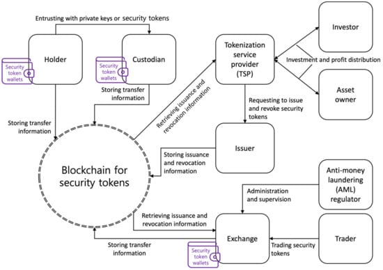 Unlike cryptocurrencies (e.g., Bitcoin [], Ether [], etc.), it is necessary to establish a service model for security tokens representing the value and ownership of a tokenized asset. The service model must include the issuance, distribution, transfer, trade, storage, and revocation of security tokens and identify role-based key components. It is necessary to identify security threats to the service model and specify the security requirements countering the identified security threats in order to preserve the user’s privacy and prevent money laundering involving security tokens.