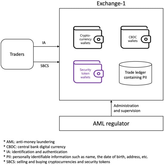 In Figure 2, Exchange-1 includes security token wallets, cryptocurrency wallets, central bank digital currency (CBDC) wallets, and a trade ledger containing personally identifiable information (PII). If Exchange-1 does not include CBDC wallets, traders can trade security tokens with traditional fiat currencies, such as USD, EUR, etc. The fact that Exchange-1 includes security token wallets means that Exchange-1 can hold security tokens. Exchange-1 identifies and authenticates traders before trading. Exchange-1 provides traders with trading between security tokens and fiat currencies, including CBDCs, between security tokens and cryptocurrencies (e.g., Bitcoin, Ether, etc.), and between security tokens. Exchange-1 stores and maintains the trade ledger containing the PII of the traders. The AML regulator administers and supervises Exchange-1 to prevent money laundering involving security tokens.