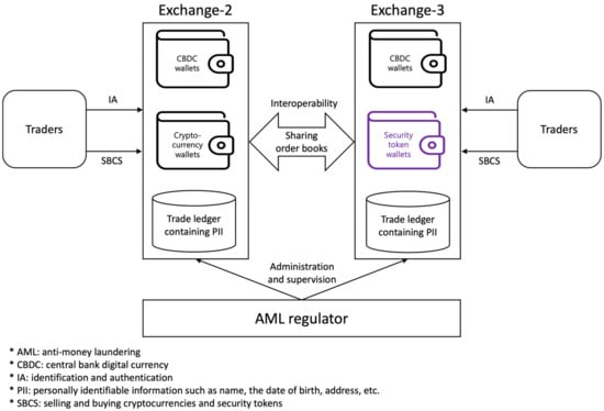 In Figure 3, Exchange-2 includes cryptocurrency wallets, CBDC wallets, and a trade ledger with PII. Exchange-3 includes security token wallets, CBDC wallets, and a trade ledger with PII. If Exchange-2 and Exchange-3 do not include CBDC wallets, traders can trade security tokens with traditional fiat currencies, such as USD, EUR, etc. Exchange-2 and Exchange-3 identify and authenticate traders before trading. Although Exchange-2 does not include security token wallets, through interoperability between Exchange-2 and Exchange-3 (e.g., sharing order books, etc.), Exchange-2 and Exchange-3 can enable traders to trade between security tokens and fiat currencies, including CBDCs, between security tokens and cryptocurrencies (e.g., Bitcoin, Ether, etc.), and between security tokens. The fact that Exchange-2 does not include security token wallets means that Exchange-2 does not hold security tokens. Exchange-2 and Exchange-3 store and maintain a trade ledger containing the PII of the traders. The AML regulator administrates and supervises Exchange-2 and Exchange-3 to prevent money laundering involving security tokens.