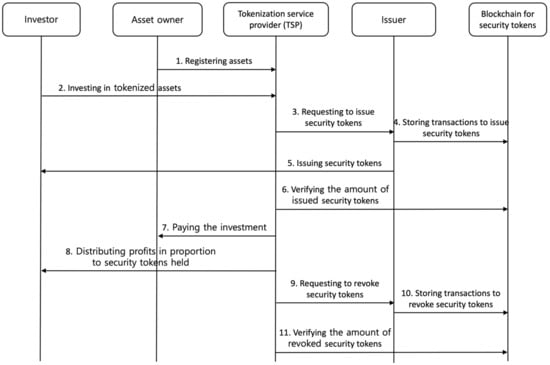 - The tokenization service provider (TSP) registers tangible assets (e.g., real estate, art, agricultural products, fishery products, livestock products, etc.) or intangible assets (e.g., music, movies, copyrights, intellectual property rights, etc.) and provides tokenized assets for investment. The TSP requests the issuer to issue and revoke security tokens and retrieves the issuance and revocation information of the security tokens from the blockchain.