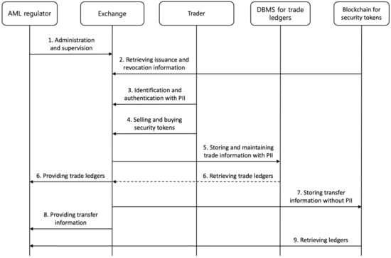 - The exchange provides the AML regulator with trade ledgers retrieved from the DBMS in accordance with AML policy. The trade ledger includes minimally required data, such as the date of trade, the identifier of a security token, the identifier of a seller, the identifier of a buyer, and the amount of traded security tokens.