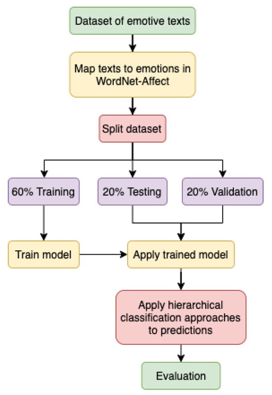 The study was designed as follows (see Figure 1): (1) automatically map text segments to emotions in WordNet-Affect, a hierarchically structured emotion classification scheme; (2) randomly split a dataset of emotive texts into training, testing, and validation sets, each containing 60%, 20%, and 20% of the data points, respectively; (3) evaluate a range of supervised classification algorithms and train the identified best-performing models; (4) apply the trained model on the testing and validation datasets produced in (2); and (5) apply and evaluate hierarchical classification approaches to the predictions generated in (4).