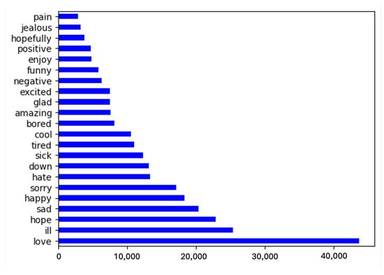 The use of Twitter as a means of self-disclosure makes it a valuable source of emotionally charged text. In particular, Go et al. [] used distant learning to acquire sentiment data from Twitter. In their approach, sentiment-baring tweets were acquired by using the Twitter Search API to collect tweets using keyword search and whether they included positive emoticons (e.g., “:)” or “:-)” for expressing positive sentiment or negative emoticons (e.g., “:(” or “:-(”) for expressing negative sentiment. Their dataset (https://www.tensorflow.org/datasets/catalog/sentiment140 (accessed on 12 December 2023)) consists of 1,600,000 unique tweets, with 800,000 positive and 800,000 negative data points. Due to the large volume of tweets, as well as the fact that they were collected for sentiment analysis purposes, this dataset was used to support the experiments presented in this paper.