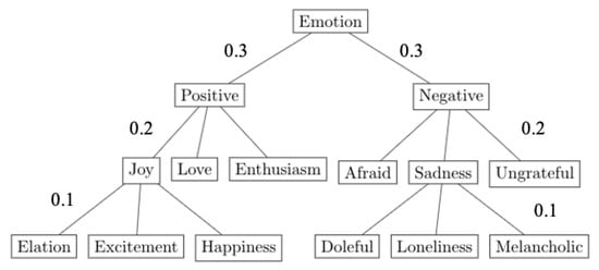 The contributions of misclassification of and can be calculated using a similar approach to distance-based classification, where an acceptable weight between and is determined. With the methodology that misclassification is less forgivable at higher levels of the hierarchy in mind, = 0.5. This is to ensure that misclassifications from the third level of the hierarchy and upwards incur increased classification punishment. For Equation (2), is replaced by , denoting the summation of the weighted edges between and . For example, when = Joy and = Happiness, = 0.1, but, when = Elation and = Positive, = 0.3.
