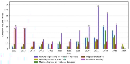 Figure 3 presents a visual representation of the annual occurrences of the relevant articles categorized based on the search phrases. An observation that emerges from the figure is the growing trend of articles published between January 2012 and February 2024. This indicates a notable surge in interest surrounding the subject of relational learning, thereby worthy of further exploration and investigation. From the potentially relevant articles, we considered 23 articles with methods related to the main topic of the articles. From those 23, we selected the most promising ones and reproduced the experiments published in the original article while performing additional tests. The following subsections summarize these methods.