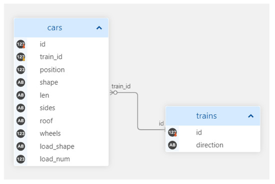 Because of simplicity, we present a sample of the Trains dataset [27] to demonstrate how the algorithm transforms the relational database into BOW representation (Table 1 and Table 2). In Figure 4, we can see the Entity Relationship (ER) diagram from the Trains dataset, which contains two tables: trains, which is the target table; and cars.