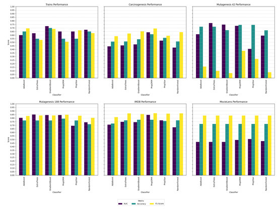 In evaluating the comparative effectiveness of traditional machine learning algorithms against proprietary models across multiple datasets, our analysis reveals noteworthy trends, which are represented in Table 6, where the highlighted cells show the best performing algorithm per metric and dataset. A more visual representation of the same results is presented in Figure 5. The traditional algorithms AdaBoost, ExtraTrees, RandomForest, and GradientBoost demonstrated consistent performance, with GradientBoost frequently achieving superior accuracy and F1 scores. This trend was particularly evident within the ‘Carcinogenesis’ and ‘IMDB’ datasets.