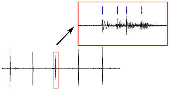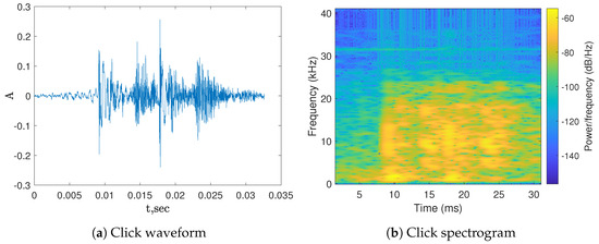 The sperm whale (cachalot) was chosen as a subject for this study among various marine mammals because of the unique characteristics of the sounds it makes. Sperm whales produce a series of single, broadband clicks that are used for echolocation, allowing the whales to find prey and navigate in the darkness of the deep ocean [44,45], as well as for communication. Each click has a multipulse structure, comprising an intense first pulse followed by several additional pulses (Figure 1).