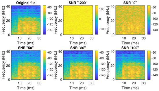 Figure 2. The effect of the SNR (signal-to-noise) ratio on the received signal. - Time shifting of certain elements within the range of −0.0001 to 0.0001 s. To implement this augmentation approach, some elements of the original signal are swapped with neighboring ones that are within a range satisfying the conditions of a given interval.