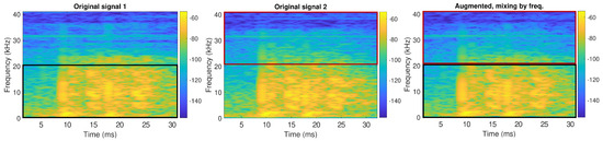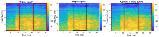 Augmentation of sound data is an important stage in the formation of datasets for training neural networks in the field of sound processing. The goal of this process is to create similar, but not identical, audio data to improve the model’s generalization ability and provide more information in situations where sufficient natural data may not be available. It is important to note that the content of an audio file can be represented in different ways, which, in turn, affects the type of augmentation method that can be applied [17]. For example, there are augmentation methods that are applied to the waveform of a signal. These include changing the pitch [37], increasing/decreasing the volume of the signal, changing the speed (speeding up or slowing down the original signal), adding random noise, silence, mixing the signal with background sounds from different types of acoustic scenes [38], adding reverb [39,40], time shift (right or left), etc.