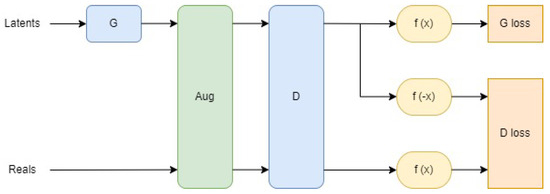 Figure 6 shows the structure of StyleGAN2-ADA. The generator receives white noise and generates images. Both real and generated spectrograms go through the same augmentation pipeline before being fed into the discriminator. The discriminator gives a score to each image, and the results are used in the evaluation of the loss function for each network. Blue represents the training networks, yellow represents the evaluation of the loss function based on the discriminator outputs, green represents the application of augmentations, and orange represents the values of the loss function.