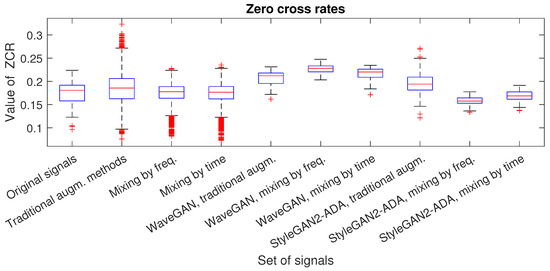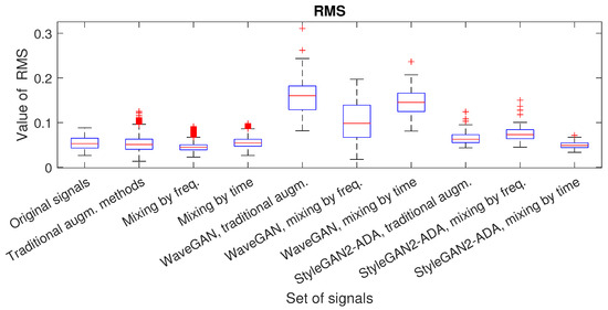 Figure 9, Figure 10, Figure 11, Figure 12 and Figure 13 allow one to compare the chunks augmented and generated using WaveGAN and StyleGAN2-ADA with the metrics from Section 3.4. Figure 9 shows the RMS values of the signal. The obtained results show a strong deviation in the values for the files generated by WaveGan, approximately twice that of the values of the original files.