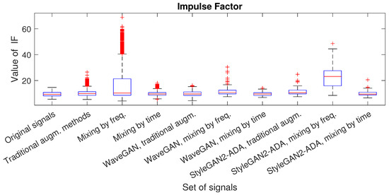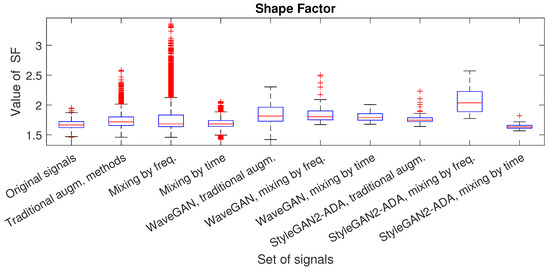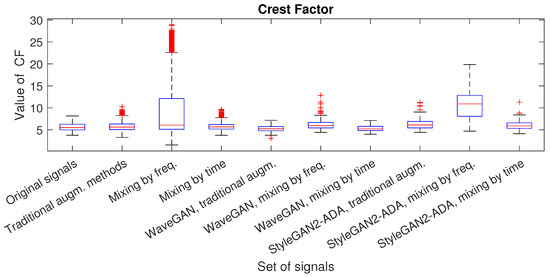 Figure 10 shows the values of the shape factor. This metric evaluates the shape of the signal regardless of its size. The figure shows that there were no strong deviations, but it is clear that for the augmented and generated files based on the mixing method along the frequency axis, the shape factor was overestimated and had many outliers. The same situation was observed for the impulse factor (Figure 11) and the crest factor (Figure 12).
