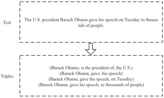 Example of triple extraction. On the top is an unstructured input text; at the bottom are some example triples corresponding to the original text.