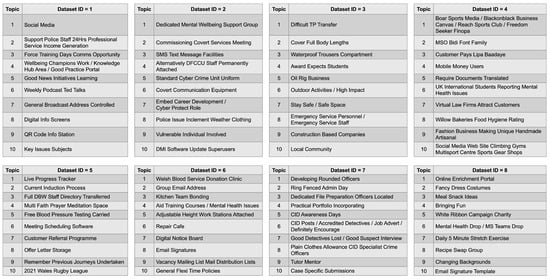 To conduct the experiments described herein, the data were provided by our industrial research collaborator, a software company that focuses on the concept of crowdsourcing solutions to strategic business challenges. The eight datasets consist of short informal responses to a range of different questions, propositions, and requests for ideas. For example, dataset ID = 1 asked its participants, “Who does the channel reach, what is the purpose of the channel, and what information does the channel share?”, whereas dataset ID = 4 asked, “What is your supply chain going to be, who are your most important customers, and how will you generate income?”. Table 1 reports the distribution of responses across each dataset, with Table 2 reporting some examples of the text responses. By utilising these datasets, each representing unique variations and characteristics, the generality of the proposed approach of expanding topic modelling outputs can be tested, enhancing its reliability and real-world applicability.