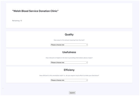 To facilitate the annotation task, a bespoke web-based annotation platform was implemented. This reduced any installation overhead and widened the reach of annotators as it was accessible using a web browser regardless of the device type (i.e., smartphone, laptops, PC, etc.). Annotators were presented with instructions explaining the task’s requirements and then with the platform’s interface (see Figure 3. The first pane contained a randomly selected topic modelling output to be annotated, as well as the remaining number of annotations left to complete. For the LDA outputs, to increase interpretability, annotators were presented with non-stemmed tokens. The subsequent panes contained the annotation choices for the aforementioned metrics. For each metric, annotators were required to label each output on a five-point Likert scale, where a score of zero signified poor quality, no usefulness, and a task that is not efficient, and a score of 4 signified high quality descriptions that contain clear and effective text that is easy to extract meaning from, that are useful in describing a topic, and that perform the annotation task in the best possible manner with the least amount of effort.
