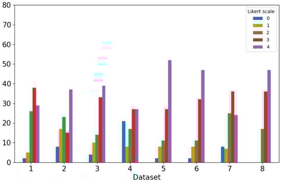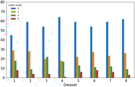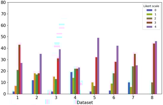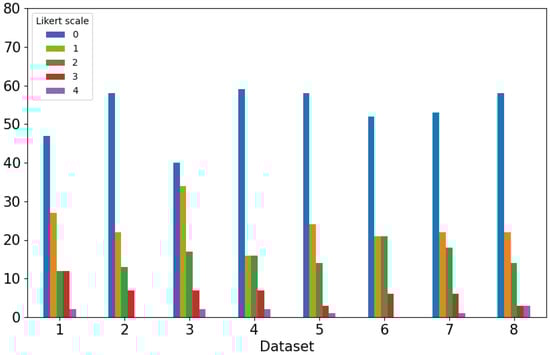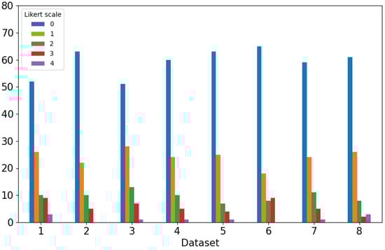 The distributions of annotations across quality, usefulness, and efficiency scales for extended topic modelling outputs across each dataset described in Table 1 are shown in Figure 4, Figure 5 and Figure 6, respectively, whilst Figure 7, Figure 8 and Figure 9 report the distributions of annotations across LDA outputs. For both quality and usefulness, the extended outputs incurred by far a highest usage of 4 on the Likert scale in comparison to the LDA outputs (quality = 302 out of 800 (37.8%), usefulness = 286 out of 800 (35.8%)). An interesting observation is that dataset ID = 8 did not receive any annotation scores of 0 or 1 for both metrics. Conversely, the LDA outputs incurred by far the highest usage of 0 (quality = 425 out of 800 (53.1%), usefulness = 474 out of 800 (59.3%)). Further analysis demonstrates that datasets ID = 2 and 6 did not receive any annotations of scores of 4 for both metrics.